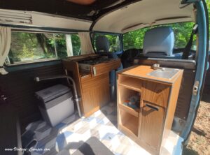 Indeed, T2 camper is suitable for 4 people with 4 beds, thanks to the sofa bed and the hood that opens to get a double bed in height.