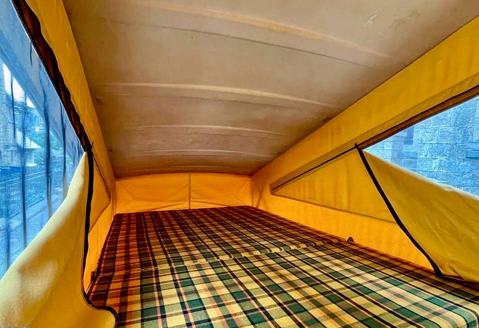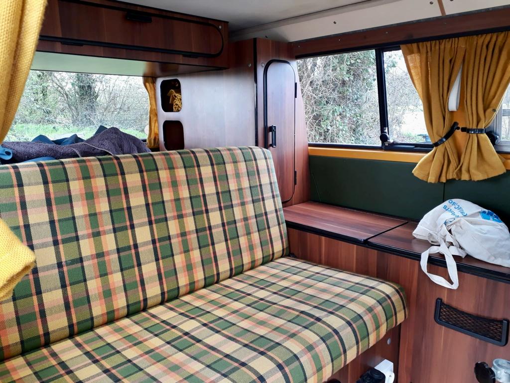 Pour dormir, vous avez le luxe de choisir votre chambre : 2 places en hauteur dans la rehausse (un vrai nid d’oiseau pour les enfants) afin de profiter de la vue dès le réveil, ou 2 places en bas sur le lit banquette.