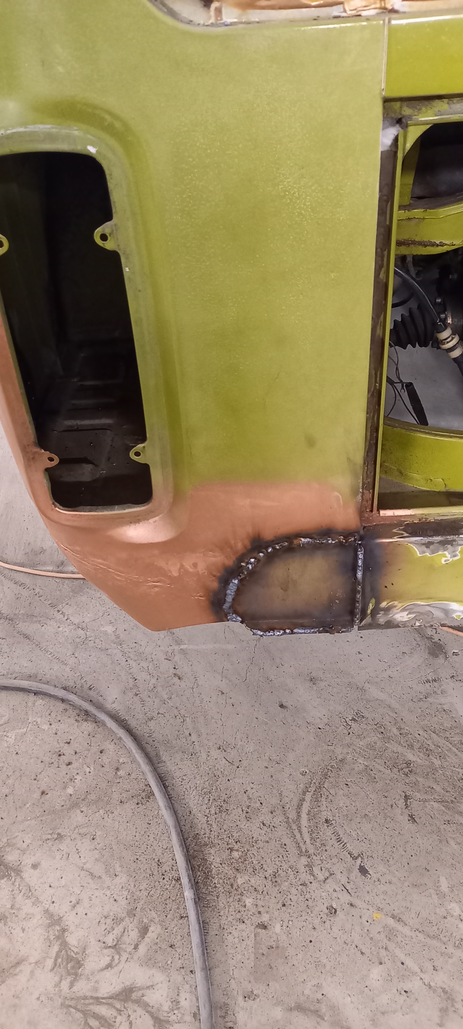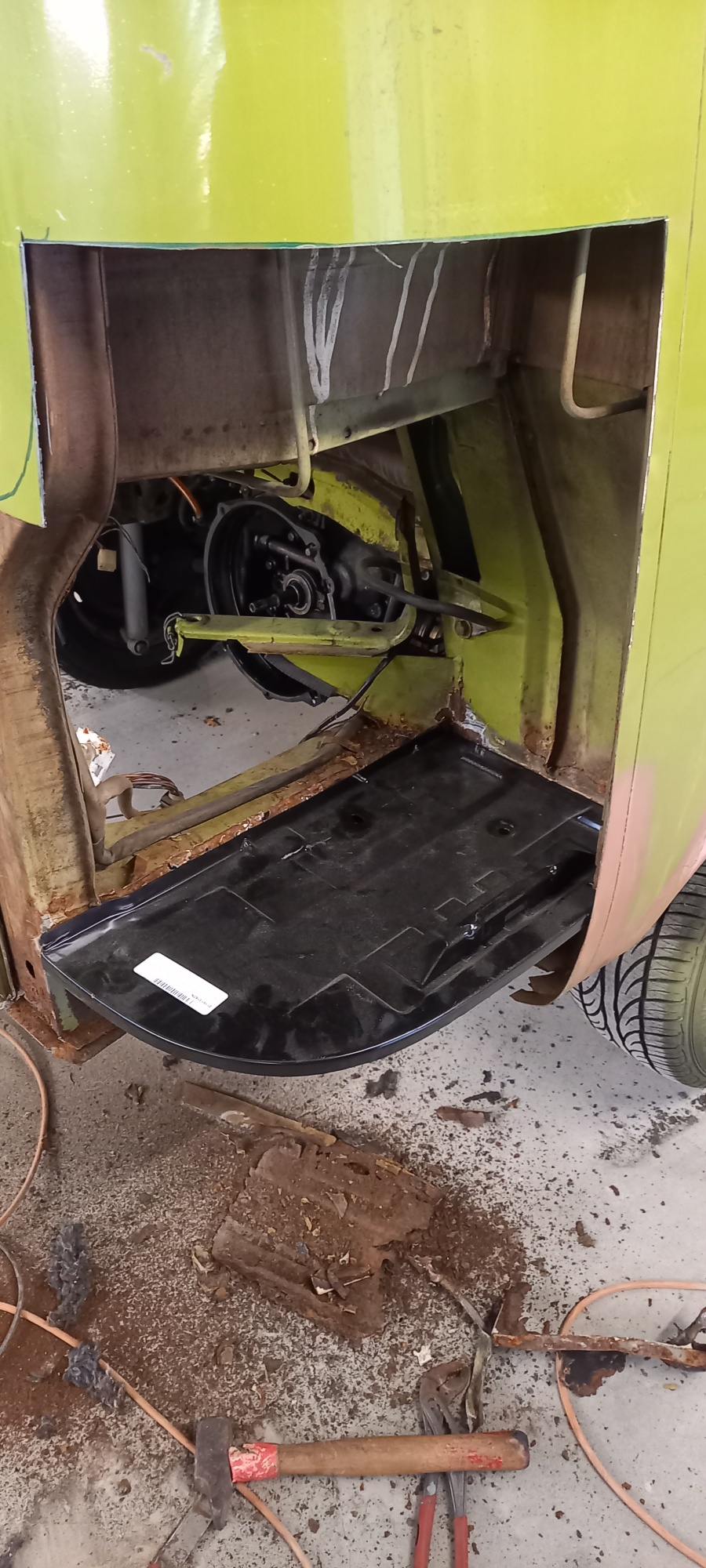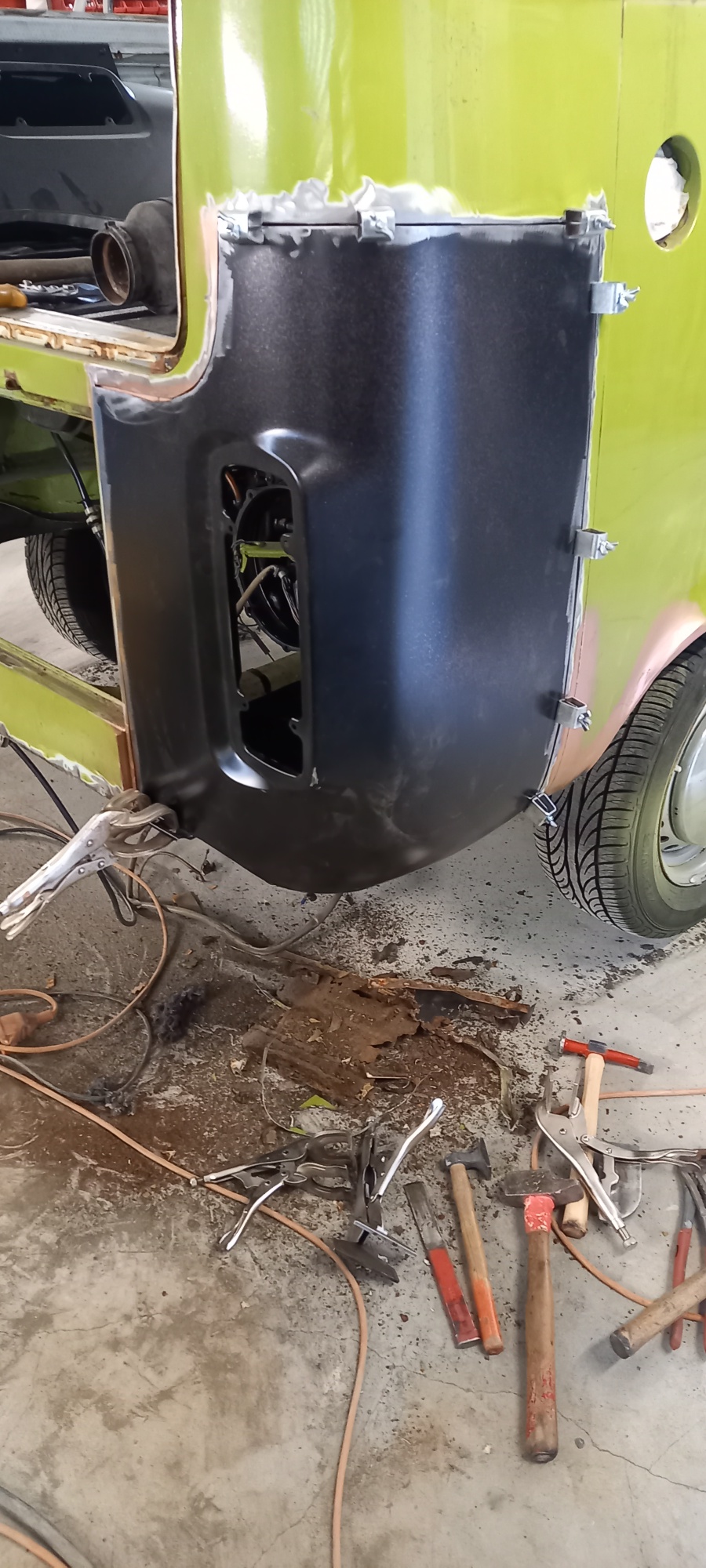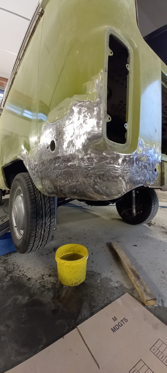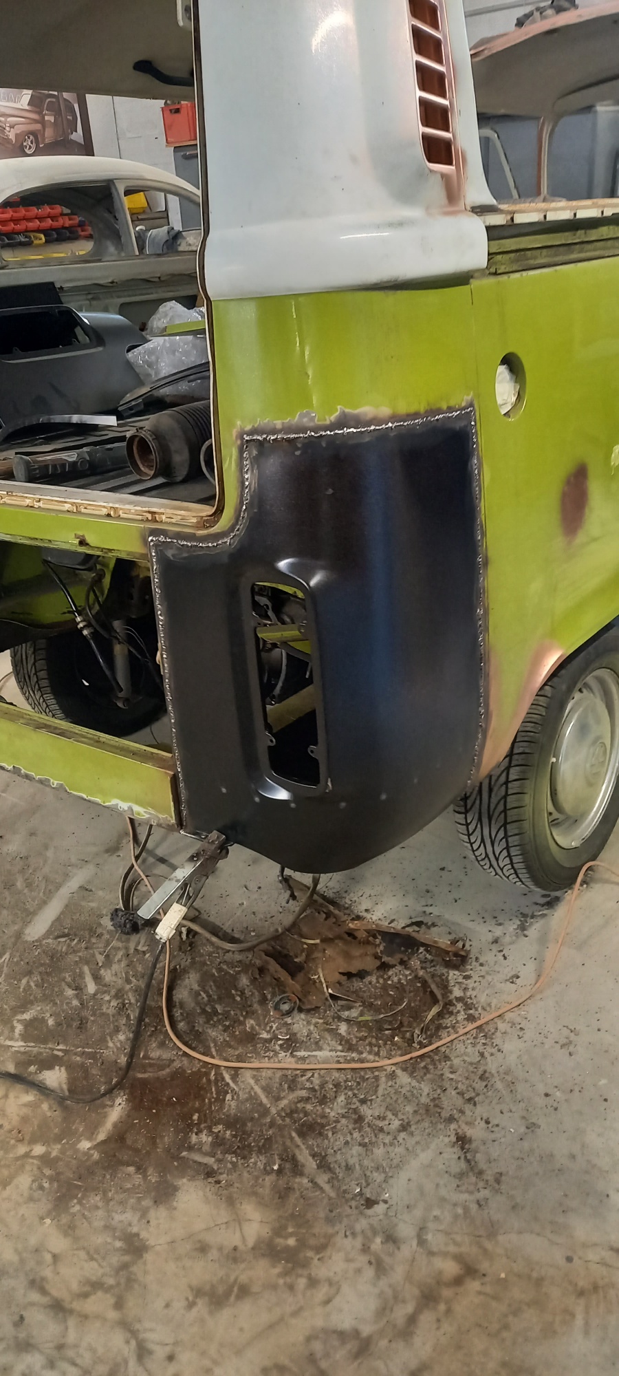 On a attaqué la carrosserie de ce combi vw minibus, le coin arrière gauche a été sauvé en le redressant contrairement au droit ou on a tout changé même le bac a batterie.