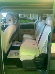 De plus, l’effet du road trip est bel et bien présent, l’intérieur du véhicule est assez sobre, un volant et une tablette centrale pour gérer tout le véhicule. Le combi est disponible en 5 places avec une banquette de 3 places, placée au centre du combi.