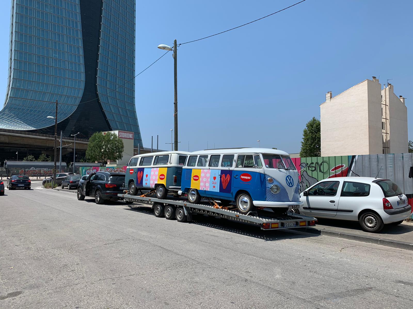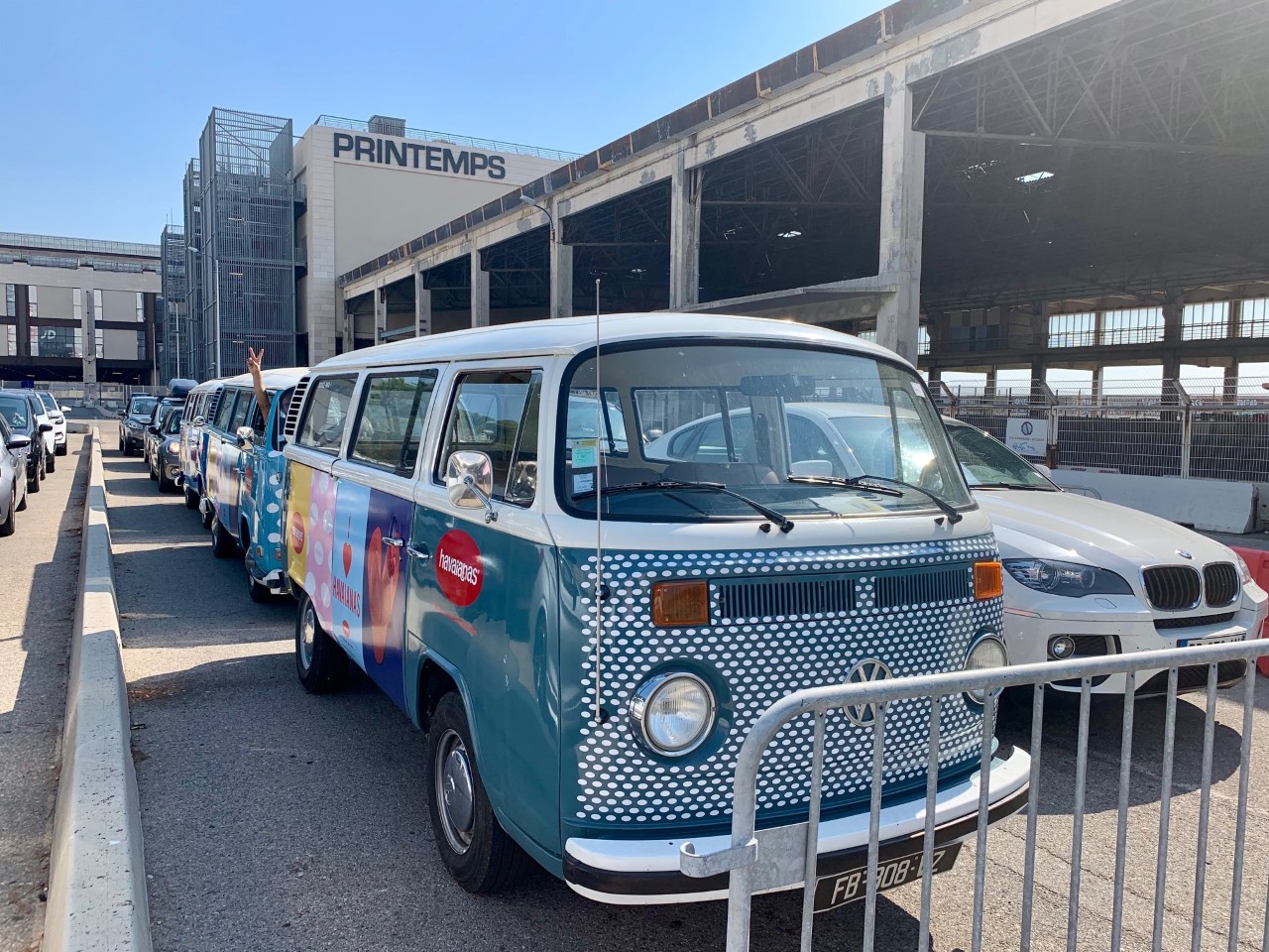 Les agences Vintage Camper Bordeaux, Toulouse et Lyon louent 3 combi minibus aux couleurs de la célèbre marque de tongues Havaianas pour transporter des festivaliers au festival Calvi on the rock en Corse