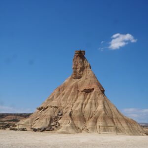Dans la partie « Blanca » du désert vous trouverez l’incontournable cheminée des fées, formation rocheuse symbole des Bardenas. Son vrai nom est Castildetierra.
