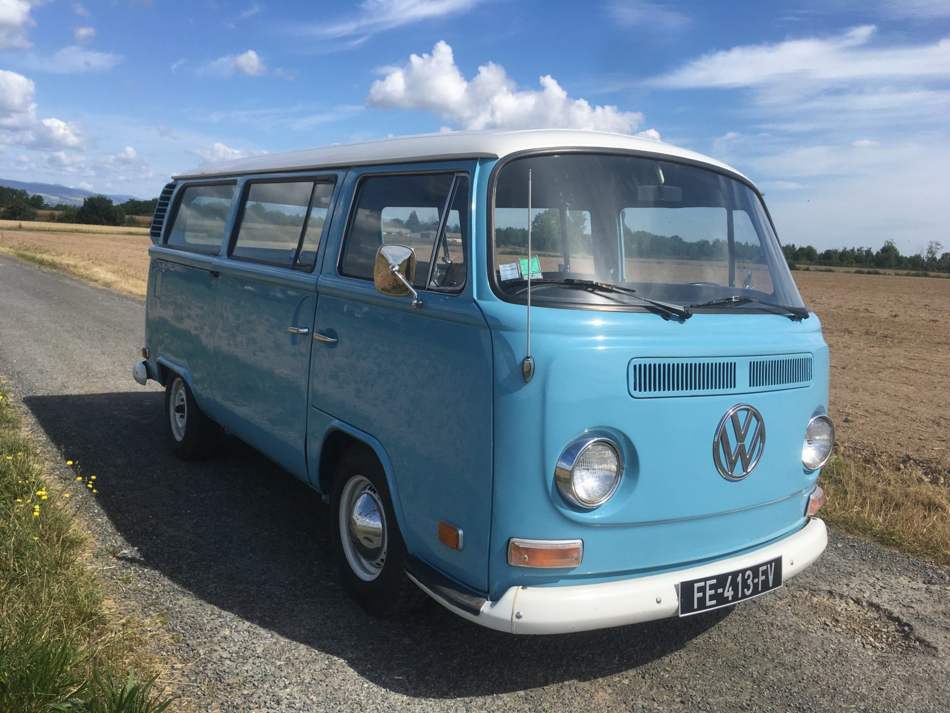 On s’arrête dans la campagne pour prendre le temps de faire quelques photos de Savane, le combi t2 minibus de 8 places. Louez le avec ou sans chauffeur pour des mariages, festival. Ou des visites de caves a vins dans le beaujolais.