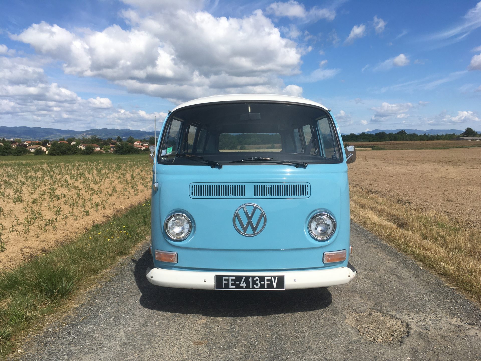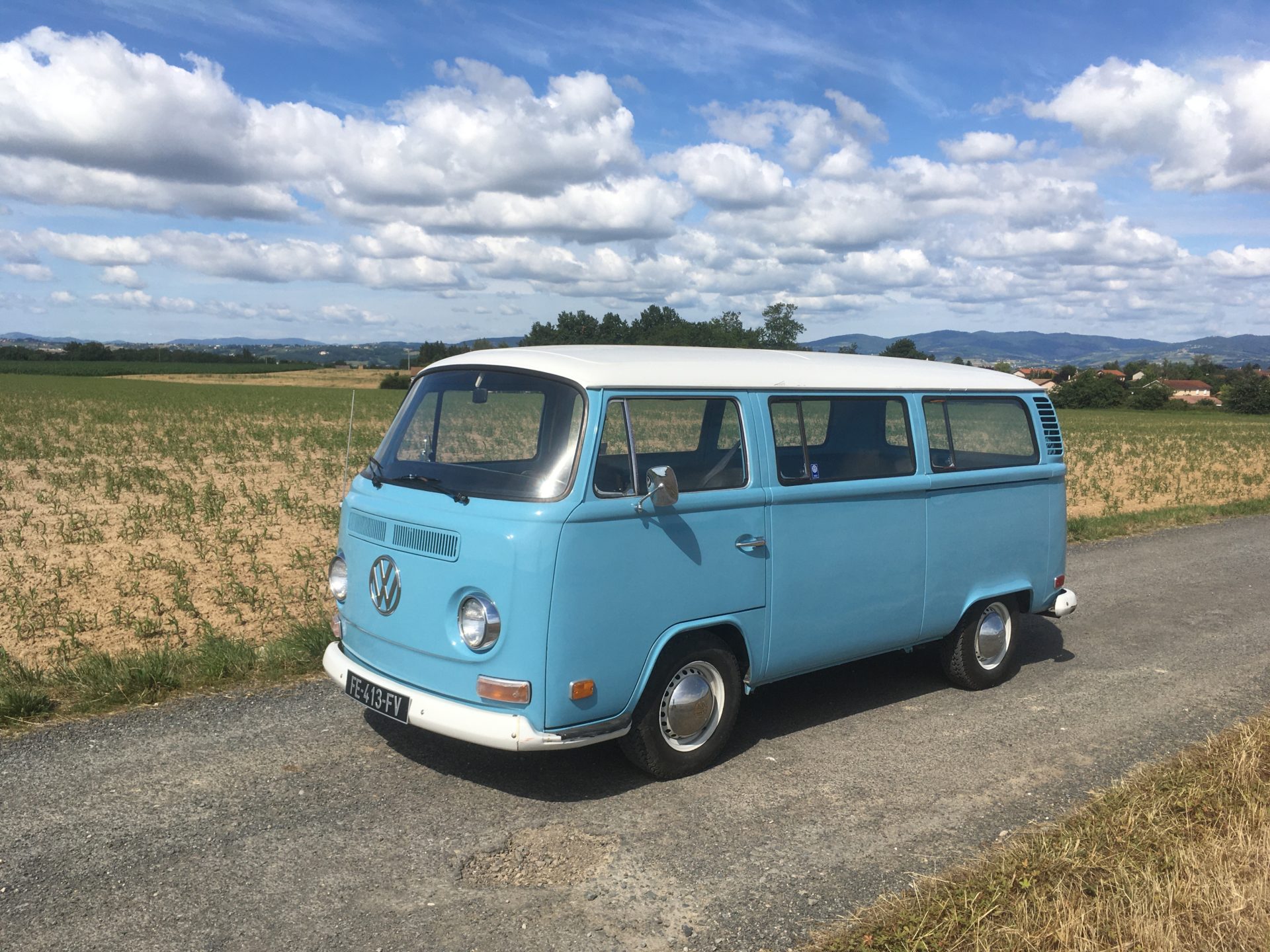 On s’arrête dans la campagne pour prendre le temps de faire quelques photos de Savane, le combi t2 minibus de 8 places. Louez le avec ou sans chauffeur pour des mariages, festival. Ou des visites de caves a vins dans le beaujolais.