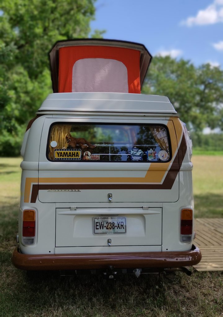Notre Combi Scooby à 51 ans mais il est toujours vaillant. Après un séjour aux USA ou il a transporté son propriétaire sur de nombreuses manifestations moto, il est arrivé en France au début des années 80. Depuis 7 ans il a repris la route et visité, l’Italie avec la région des lacs, la Bretagne, la Vendée, les gorges du Tarn, la Dordogne, le Pays Basque, la Camargue, rien ne l’arrête.